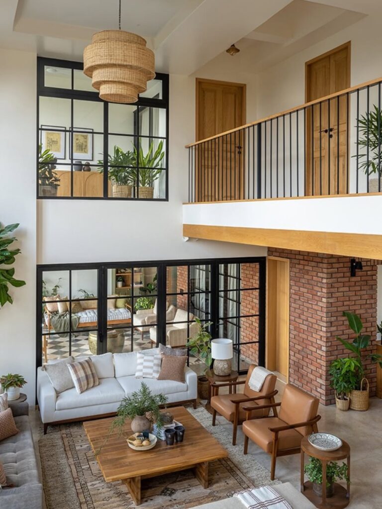 Trần cao hai tầng không chỉ tạo cảm giác thông thoáng cho không gian mà còn duy trì sự liền lạc về thị giác. Các khung cửa sổ lớn với rèm màu sáng giúp tận dụng triệt để nguồn sáng tự nhiên đồng thời gia tăng sự kết nối với môi trường bên ngoài. Những cửa kính lớn đóng vai trò như “vách ngăn mềm” giữa các phòng trong khi vẫn giữ được độ mở cần thiết cho không gian.